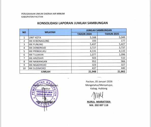 Perusahaan Umum Daerah Air Minum Kabupaten Pacitan menyampaikan Konsolidasi Laporan Jumlah Sambungan Tahun 2024–2025 sebagai bagian dari dokumentasi dan evaluasi ...
